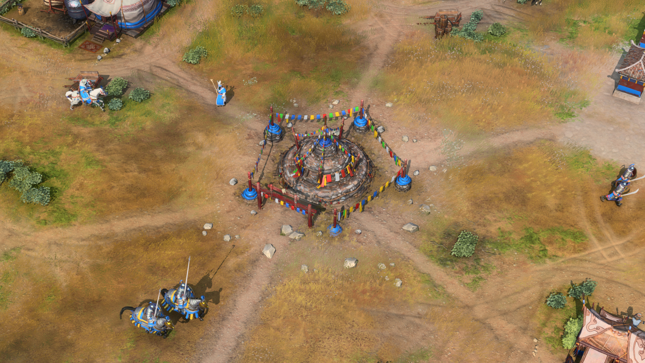 At the dawn of battle in Age 1, the Mongols start off with several unique buildings to grow their nomadic empire. Despite having no access to farms or walls, the Ovoo and Ger—unique buildings to the Mongols—provide crucial advantages in this early Age.