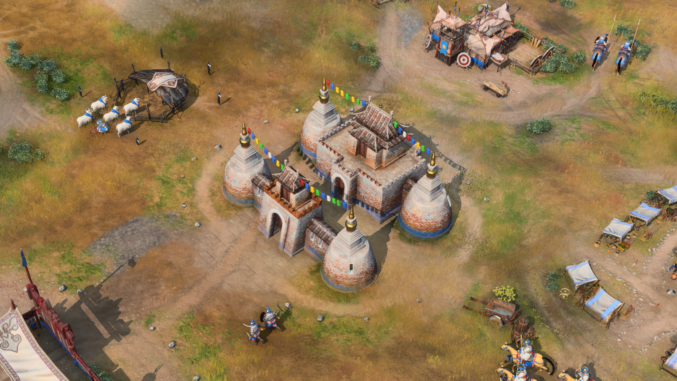 By Age 3, the Mongols civilization is thriving. The Steppe Redoubt landmark pushes their economy to new heights, acting as a Ger that increases gold drop-offs and funneling more resources for a rapidly growing military force.