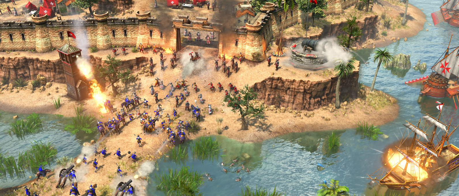 Guard the Mediterranean against incursions with unique fortifications, don shining armor to fend off attacks, and shell opponents from afar with Fixed Guns. Fire Throwers and greatswords win battles, but the superior logistics of your Commandery win wars. Luckily, you can have both! Fighting at sea with Order Galleys may wet the gunpowder, but your Arbalesters won’t mind. You can always restock at a Gunpowder Depot, or blow it up when an enemy army marches past!