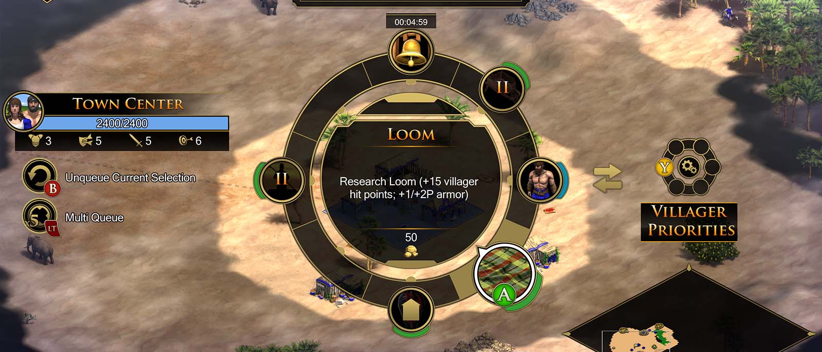 - Research Loom to increase the Health and Armor of your Villagers, granting them greater survivability