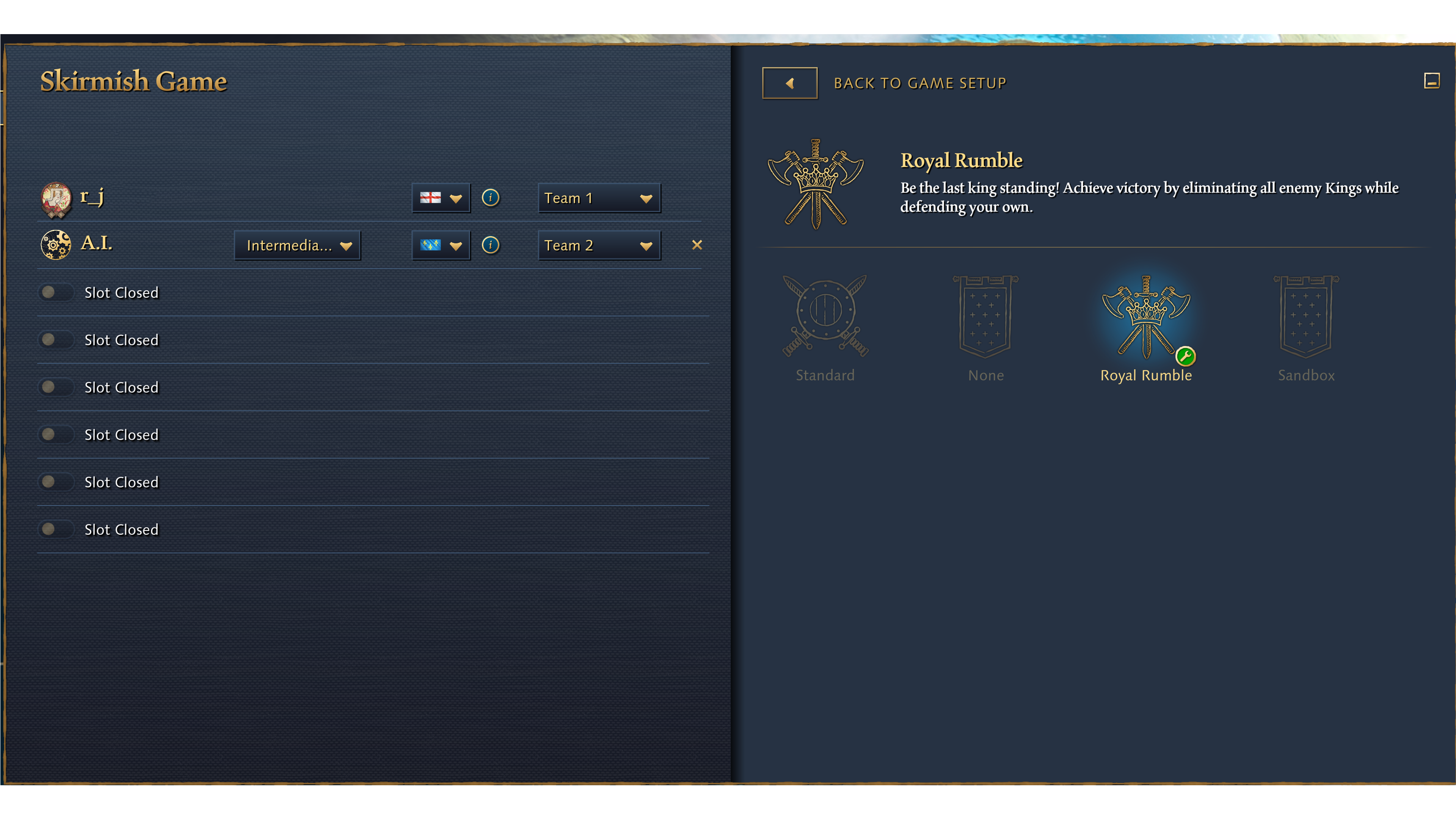 - DESCRIPTION: Be the last king standing! Achieve victory by eliminating all enemy Kings while defending your own. Based on the classic Age of Empires II game mode “Regicide.”