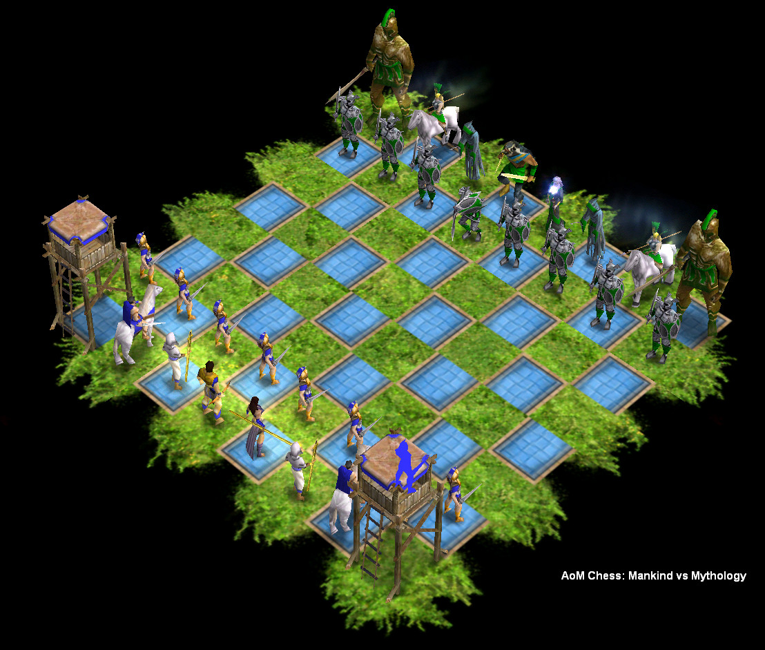 The image below shows some of the units in Age of Mythology in a chess board-style set up. This one is especially interesting because Jithral turned it into a game of “mankind vs. mythology”. The choice of Colossi as towers for the mythological units is really cool.